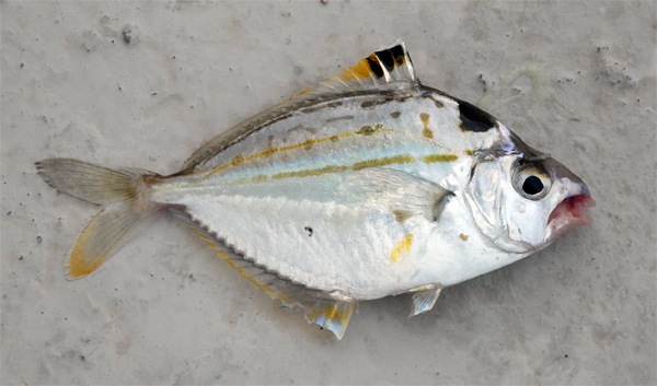 몸의 형태는 타원형에 가까운 나뭇잎 모양이며 옆으로 납작한 형태이며 머리에는 비늘이 없다. 몸높이가 높은 모양이며, 등쪽이 배 쪽 외곽보다도 더 많이 올라와 있다. 머리 등 쪽 부분은 둥글고 두 눈 사이는 움푹 들어가 있는 형태이다. 주둥이 끝은 잘린 모양이며 입은 아래쪽으로 열려 있고 입을 닫으면 아래턱은 35∼45° 각도로 위로 향한다. 입은 관 모양으로 앞으로 내밀 수 있다. 비늘은 작고 떨어지기 쉽다. 몸의 체색은 청색을 띤 은백색으로 등 쪽이 푸른 형태이다. 살아 있을 때는 전체적으로 은백색을 보이며, 몸통 하단부와 복부에는 작은 흑점들이 흩어져 있고, 등지느러미 기부의 바로 아래, 몸의 중앙과 그 사이에는 연한 갈색의 종대 무늬가 있다. 머리 뒤와 등지느러미 기점 사이에 커다란 흑점이 있고, 등지느러미 1∼4극 조 사이에도 커다란 흑점이 있다. 다른 지느러미에는 흑점이 없다. 위턱의 뼈와 이마의 뼈를 마찰시켜 소리를 내는 습성이 있다.