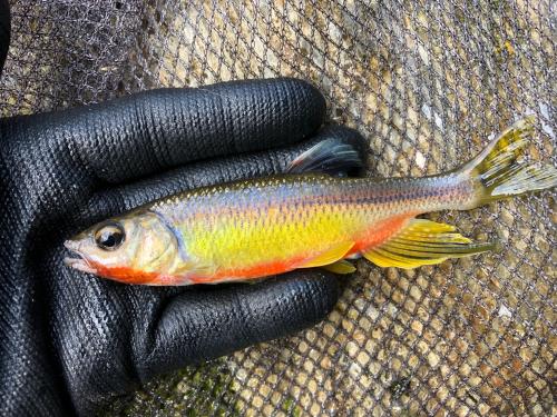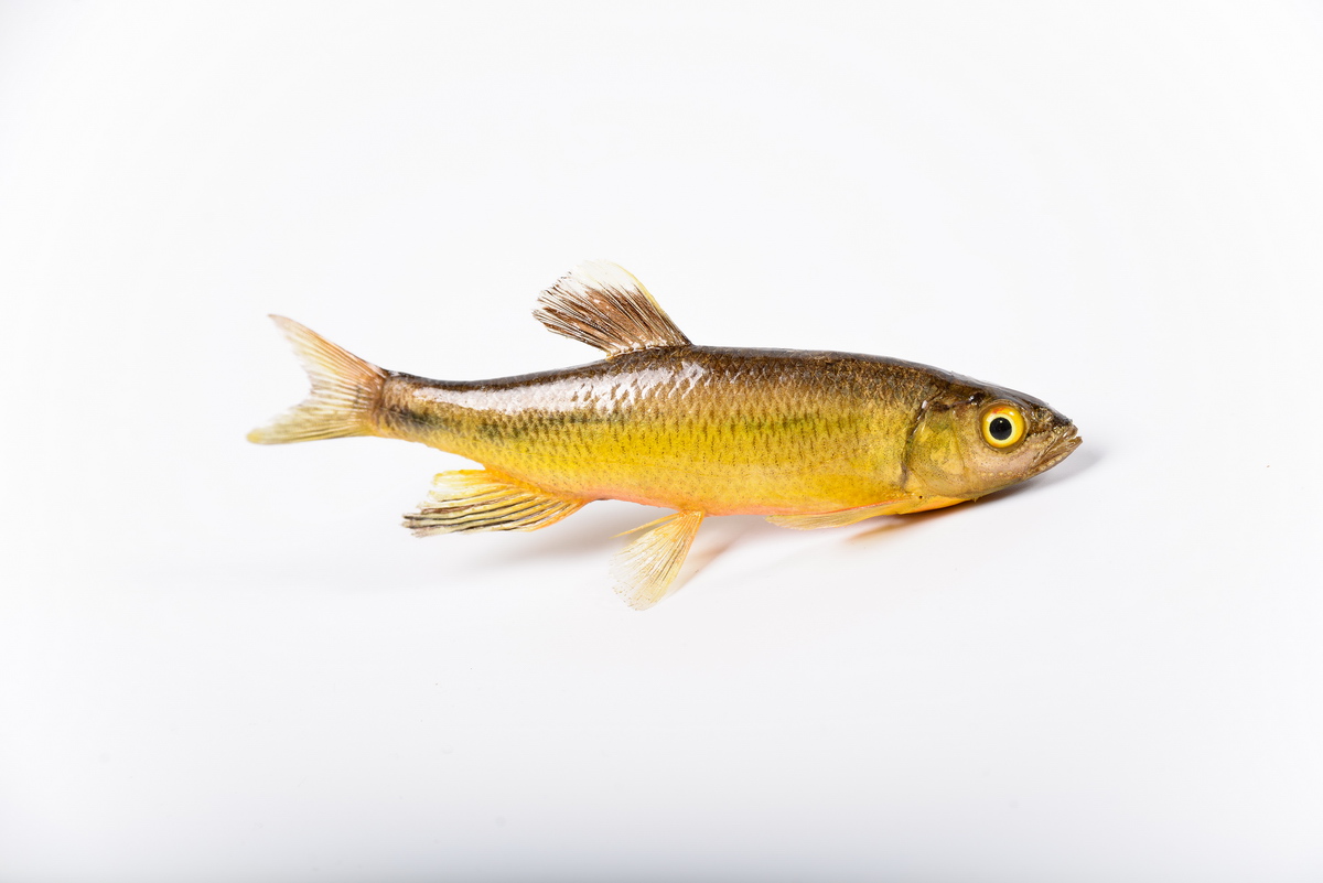 몸의 색은 붉은색의 띠무늬가 가슴지느러미 부근에 나 있으며, 전체적으로 등 쪽 부분은 갈색, 배 쪽은 노란색을 띠며, 등지느러미 상단은 흰색 또는 노란색을 띤다. 큰 눈은 검은색을 하고 있고, 주둥이는 짧고 끝이 다소 뭉툭하다. 옆줄은 완전한 형태로 몸통 가운데 부분에서 아래쪽으로 오목하게 나 있다. 등지느러미가 시작되는 점 아래의 몸통 옆면 가운데에서부터 꼬리지느러미 앞까지에는 청색이나 담흑색의 폭이 넓은 세로띠가 있다. 가슴지느러미의 앞쪽 가장자리는 적색 띠무늬가 있다. 입 수염은 없고 뒷지느러미는 길지만 피라미보다는 짧다. 번식기에 수컷은 주둥이 옆면, 눈 아래, 아래턱 옆면과 뒷지느러미의 지느러미 줄기 위로 번식기에는 수컷의 피부 표면에 표피가 두꺼워져 사마귀 모양으로 돌출되는 돌기(추성)가 열을 지어 나타나고, 몸통의 옆 아랫부분이 노란빛을 띤다.